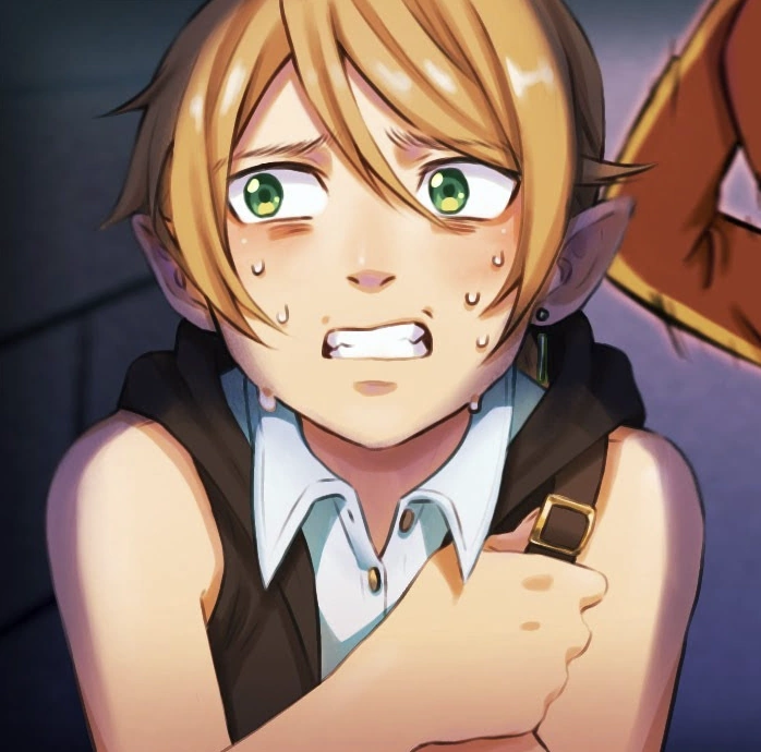 Flynn is a halfling male warlock with dirty blonde hair in a ponytail and green eyes, who carries himself casually. He has a brown sleeveless hooded vest with a white undershirt and a normal belt, to contrast Alastyr's belt. He wears brown leather boots that go up to his calves. He has a satchel bag over his shoulder that holds a bottle, containing a large room with lavish furniture and the genie Geruda inside, who is his patron.